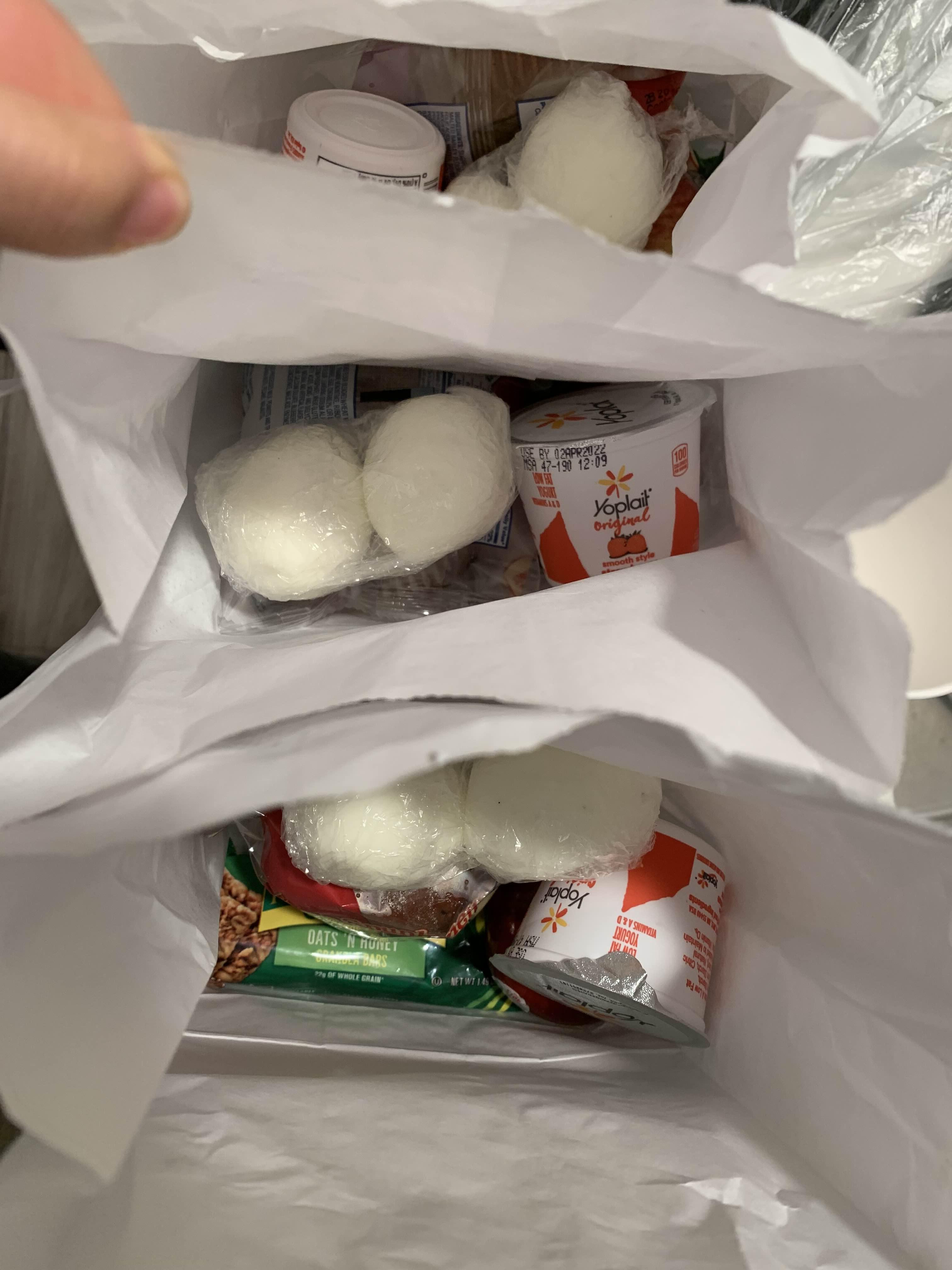 삶은 계란 2개, 요거트, 사과, 머핀, 바(bar)